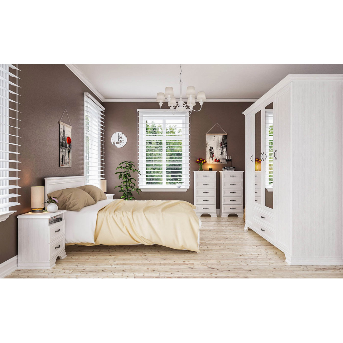 Мебель для спальни Юнона от фабрики Мебель-Неман композиция 3 - спальный гарнитур в классическом стиле с отделкой структурной фактуры, обрамленный рамочным фасадом, где металлические ручки выгодно подчёркивают стиль и изящество, всегда актуален и востребован.
